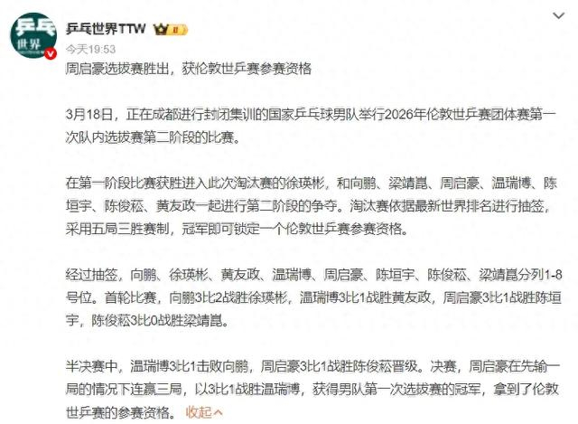 周启豪力克强敌晋级世乒赛 男队阵容待樊振东归